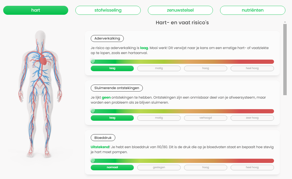 Op basis van je bloed en levensstijl bouwt Synapse een digitaal model van je gezondheid, zodat je in één oogopslag ziet welke risico's je loopt en waar je kansen liggen.